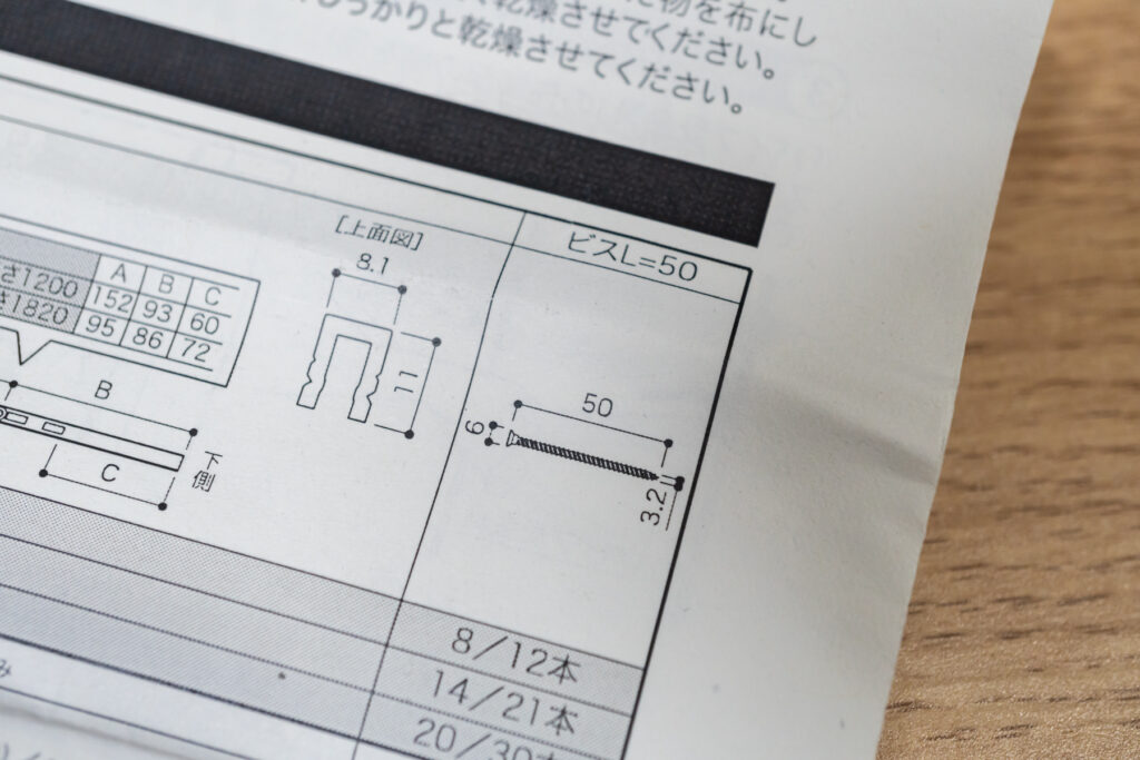 棚柱にもネジがついているが、木の下地に打つわけではないので一応軽天用のビスも購入した。