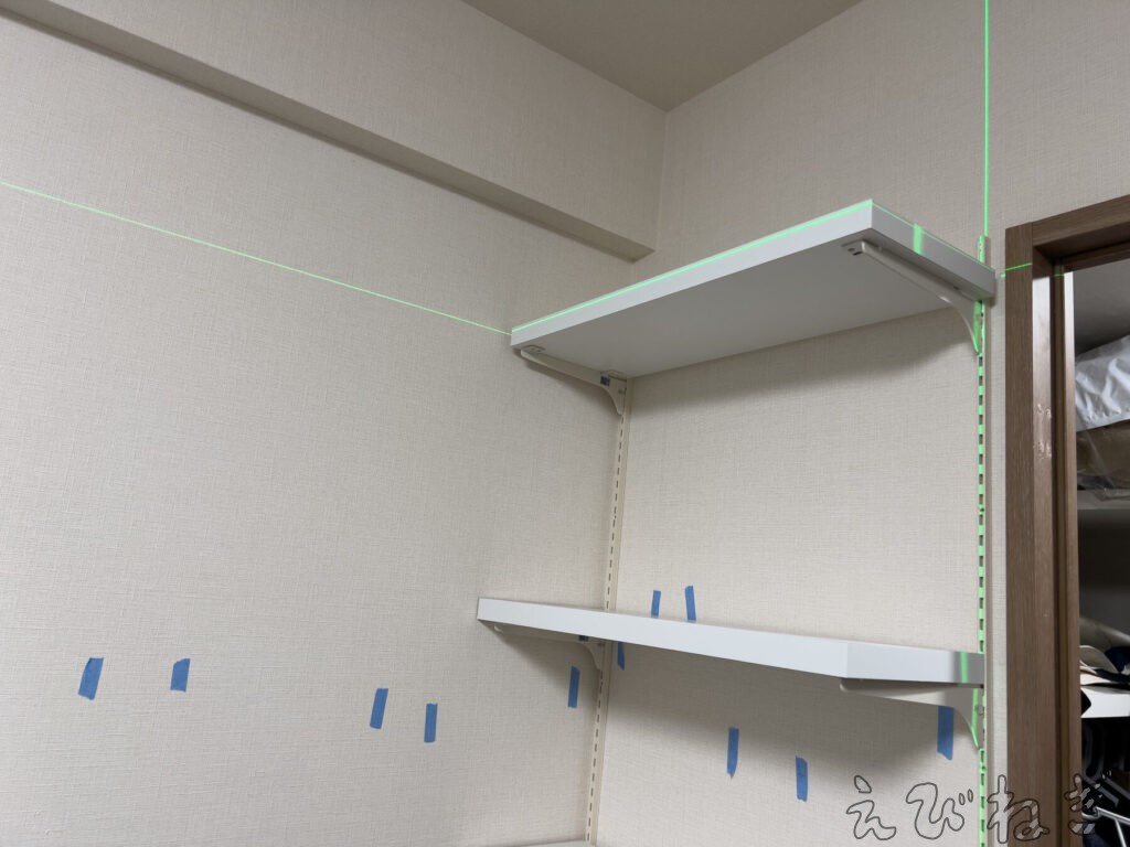 自分の場合はレーザー墨出し器を購入したので、レーザーの横線によって水平位置を確認して、2本目の棚柱も装着した。