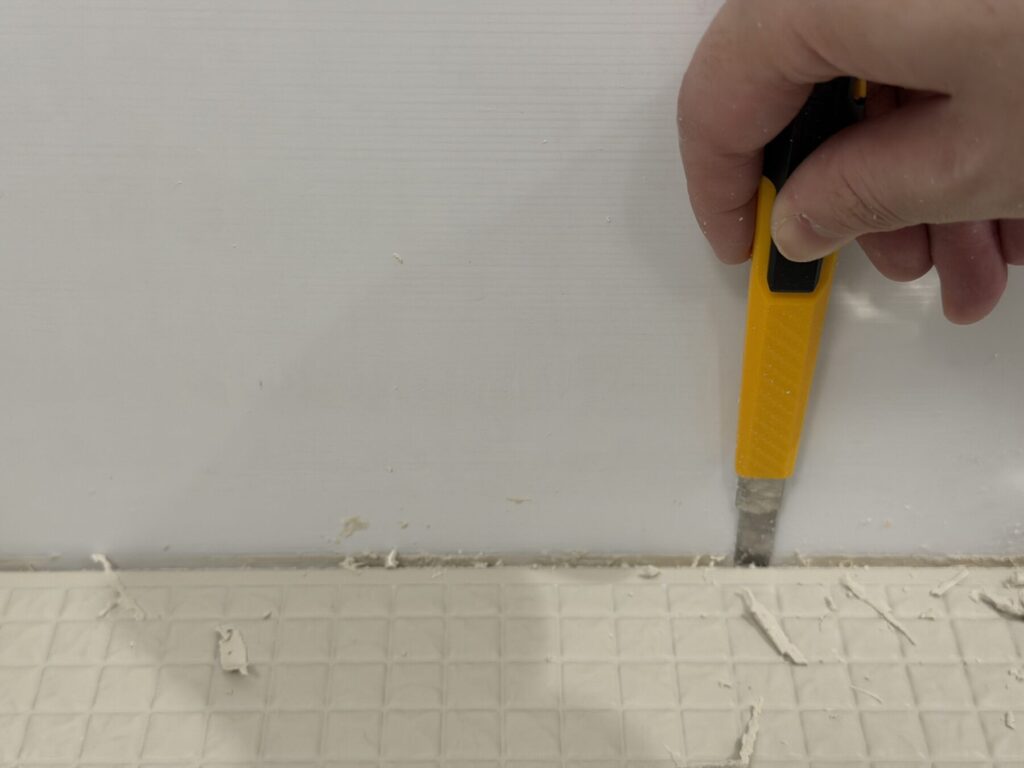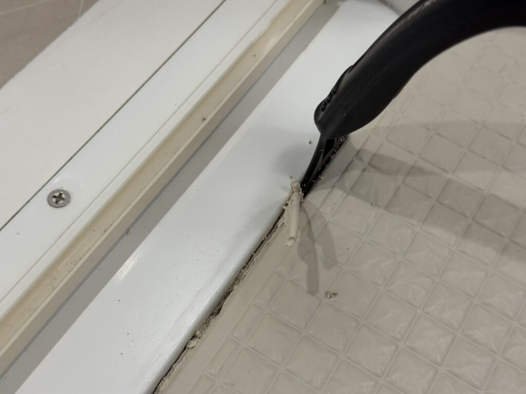コーキングはがしが若干期待外れだったので、普通のカッターも使ってゴリゴリと削っていく。